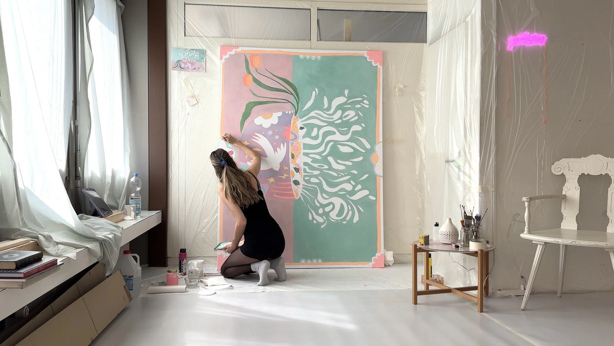 Over the course of six months, from February to August 2024, I worked in my first ever “real” Studio in Bolligen. The idea was to create 4 huge canvas as I finally finally got a space to do that. I dedicated my time in the studio exploring the question on the ever changing process of life and how its shaping and effecting my role within. A significant part of my work here, is the confrontation with the fact that my parents grow older and since I live far away from them it seems like they get older in a kind of timelapse. Does my responsibility change? Do we kind of switch roles? Also the fact that they will not live forever and that it is just the natural way of life. How can you deal with a fact that is so impactful and inevitable? Can one find beauty in this neverending circle of experiences? Is it even our duty to find the beauty in it because we have to move on anyway? Can I be brave and stay hopeful that I will manage all of the things that happen and will happen one day?